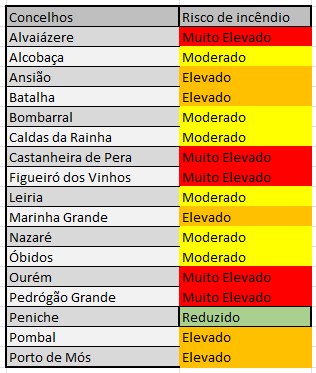 De acordo com a avaliação do Instituto Português do Mar e da Atmosfera (IPMA), é sobretudo na zona litoral da região que o risco é mais baixo. É o que o sucede com Leiria, Bombarral, Caldas da Rainha, Óbidos, Alcobaça e Nazaré. Ao invés, na zona mais interior – nos concelhos de Alvaiázere, Castanheira de Pera, Figueiró dos Vinhos, Pedrógão Grande e Ourém -, o risco de incêndio permanece no segundo nível mais alto, isto é, muito elevado.