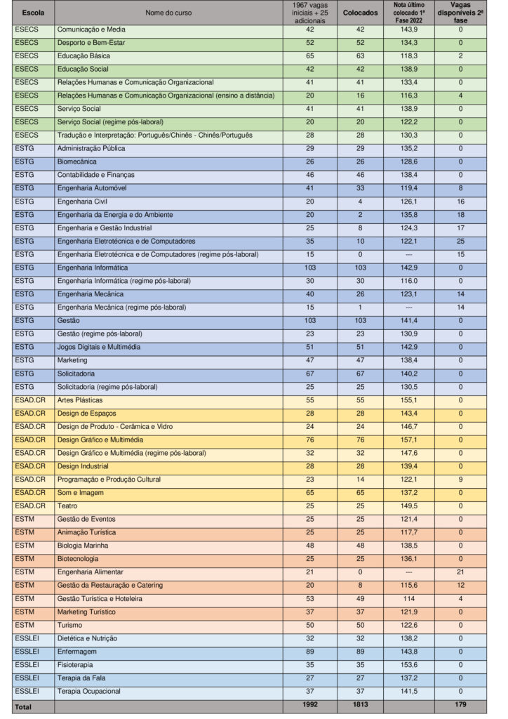 Quanto às médias mais altas de entrada – do último estudante colocado – entre os cursos que completaram a totalidade das vagas, destacam-se as de Design Gráfico e Multimédia (157,1), Artes Plásticas (155,1), Fisioterapia (153,6), Teatro (149,5), Design de Produto – Cerâmica e Vidro (146,7), Comunicação e Media (143,9), Enfermagem (143,8), Design de Espaços (143,4) Engenharia Informática e Jogos Digitais e Multimédia (142,9), Terapia Ocupacional (141,5), Gestão (141,4) e Solicitadoria (140,2).