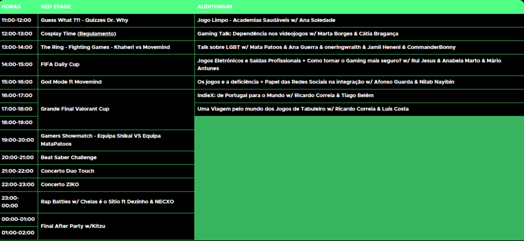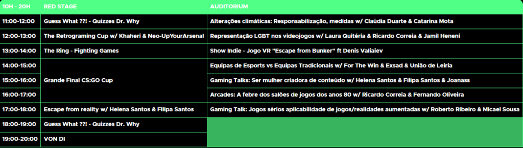 Com duração de 22 horas, o evento conta com dois palcos “que terão vários conteúdos sobre videojogos, desportos eletrónicos, personalidades digitais, debates sobre a indústria, artes performativas, apresentação de projetos regionais, entre outros”, revelou o Município de Leiria