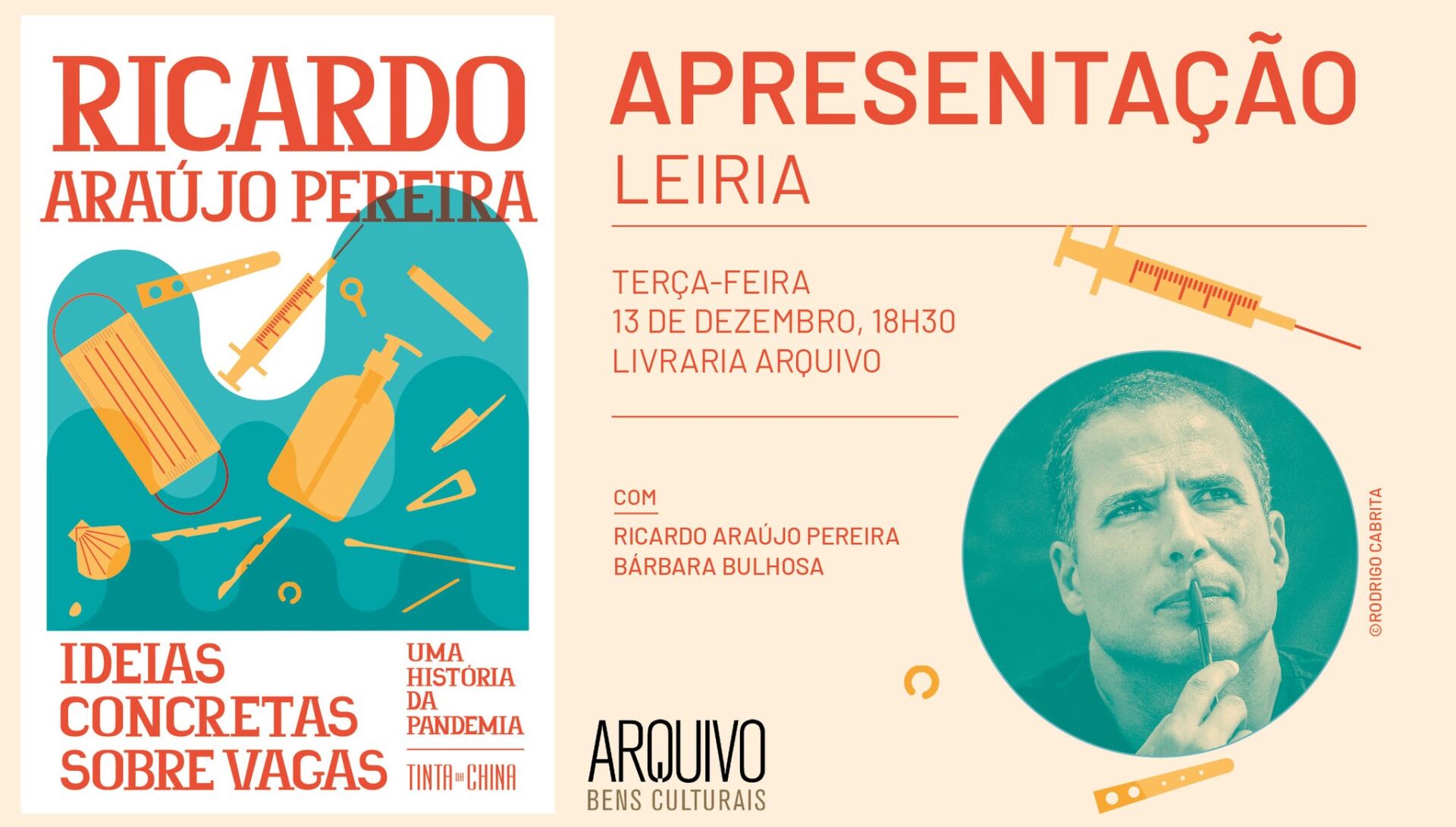 “Ideias concretas sobre vagas – Uma história da pandemia”, de Ricardo Araújo Pereira, é apresentado em Leiria, na livraria Arquivo, no dia 13 de dezembro, com presença do autor e da editora, Bárbara Bulhosa, da Tinta da China.