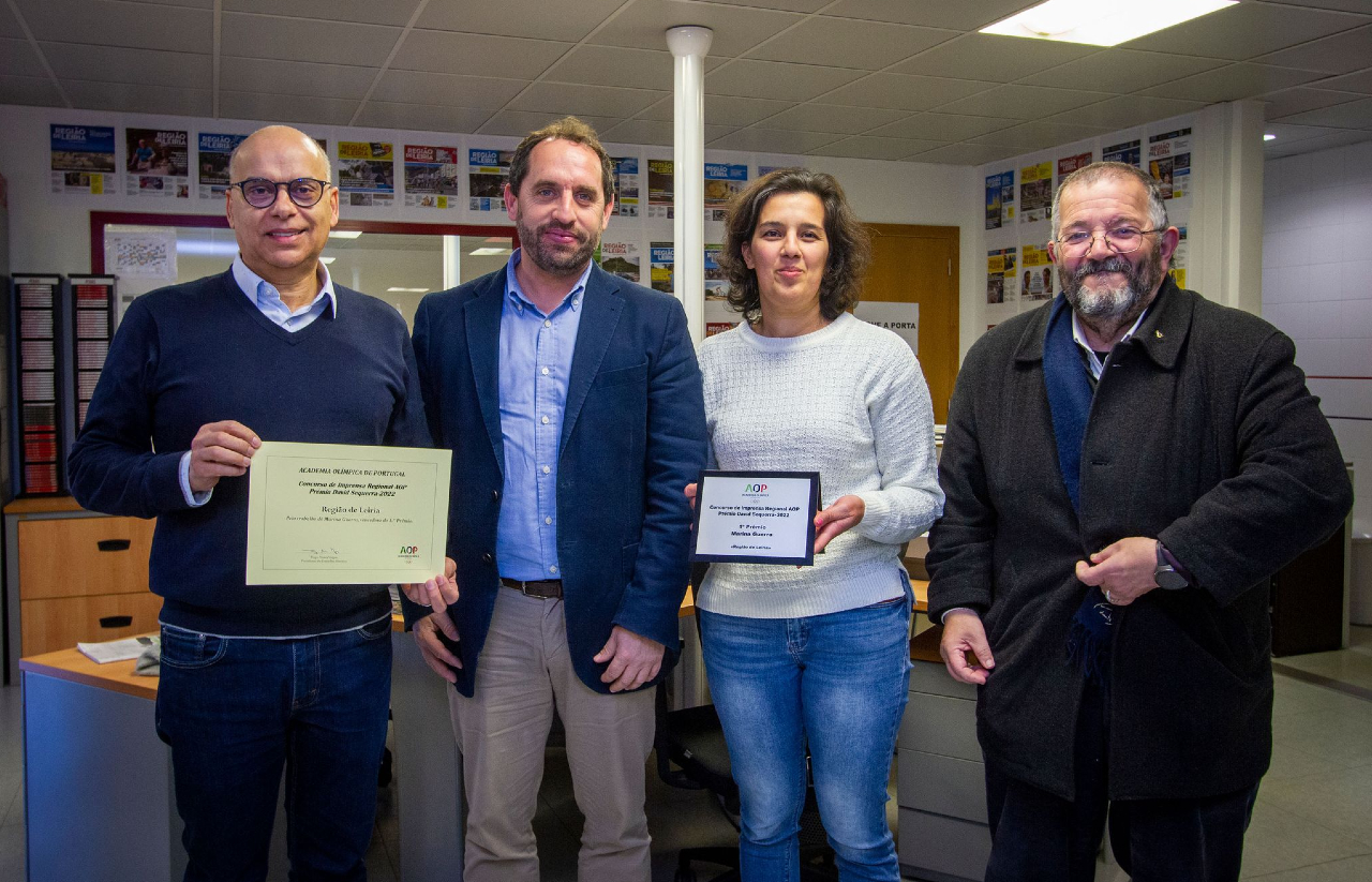 Marina Guerra, jornalista do REGIÃO DE LEIRIA, recebeu esta quarta-feira, dia 25, o 1º. prémio do Concurso de Imprensa Regional da Academia Olímpica de Portugal (AOP) – Prémio David Sequerra 2022, pelas mãos de Tiago Viegas, presidente da direção da AOP, e Afonso Candeias, vogal da direção.