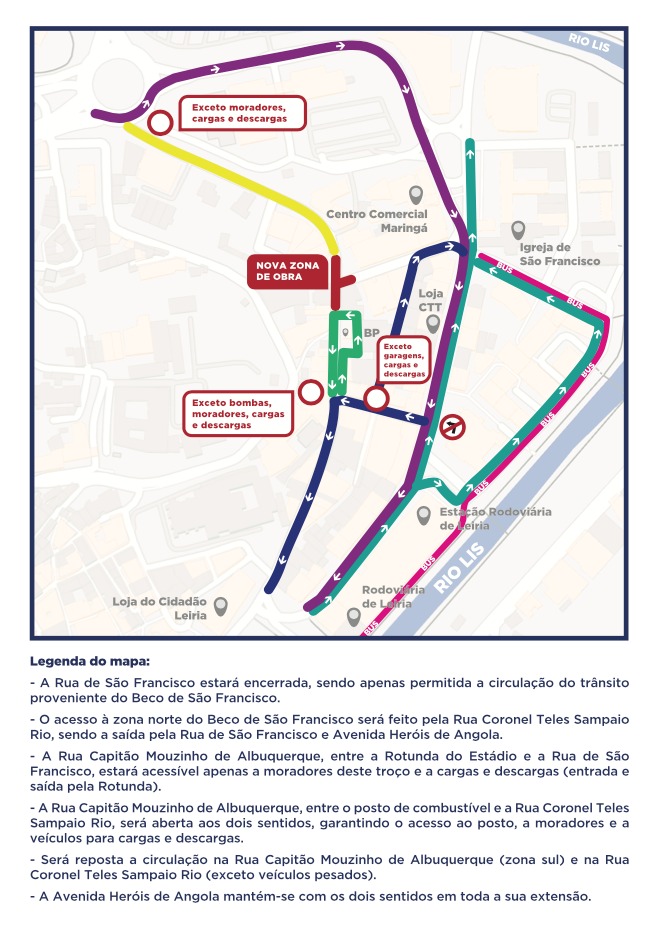Segundo adianta a Câmara de Leiria em comunicado, “esta será a grande mudança na circulação do tráfego”, sendo que passa a ser também condicionado o trânsito na rua Capitão Mouzinho de Albuquerque, a partir da rotunda do Estádio até ao entroncamento com a rua de São Francisco. O acesso fica apenas garantido para moradores neste troço e para cargas e descargas, sendo a entrada e a saída feitas pela rotunda.