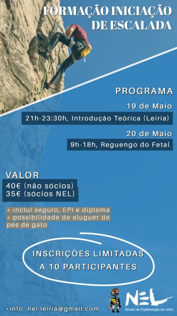A formação tem um custo de inscrição de 35 euros (40 euros para não sócios do NEL) e inclui seguro, EPI e diploma. Inscrições pelo email nel.leiria@gmail.com .