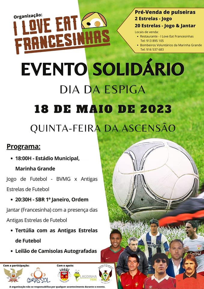 Um jogo de futebol com antigas estrelas de futebol, e não só, uma ação solidária e um jantar tentador. A sugestão é do espaço I Love Eat Francesinhas, na Marinha Grande, e vai ter lugar no dia 18 de maio, Dia da Espiga e feriado municipal da cidade.