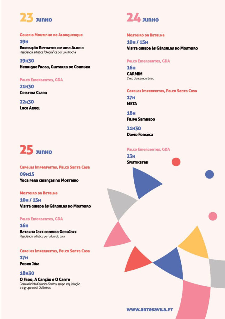 A música de domingo, dia 25, é de Batalha Jazz convida GeraJazz (16h), Pedro Jóia (17h) e “O fado, a canção e o cante” (18h), este um espetáculo com encenação de Tobias Monteiro que, segundo a organização, servirá, simbolicamente, para celebrar os 40 anos de classificação do Mosteiro da Batalha como Património Mundial da Humanidade da UNESCO.
