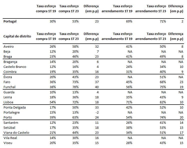 Em termos absolutos, segundo o Idealista, Lisboa é a cidade onde as famílias têm de fazer um maior esforço para arrendar uma casa – 82% dos rendimentos no primeiro trimestre deste ano. Já as cidades onde pesam menos são Castelo Branco (34%), Coimbra (40%), Santarém (41%), Leiria e Viseu (43% cada). De referir que todas as capitais de distrito apresentaram taxas de esforço superiores ao recomendado, de 33%.Quanto à taxa de esforço para comprar casa, aumentou em todas as capitais de distrito nos últimos quatro anos, com exceção de Portalegre, onde diminuiu dois pontos percentuais. Por outro lado, foi no Funchal onde mais cresceu (40 pontos), seguindo-se Faro (37), Ponta Delgada (33), Aveiro (32), Porto (24), Braga (23), Viana do Castelo (23), Évora (23), Leiria, Lisboa, Setúbal (com 18 cada), Coimbra (16), Vila Real (16), Viseu (15) e Santarém (11).
