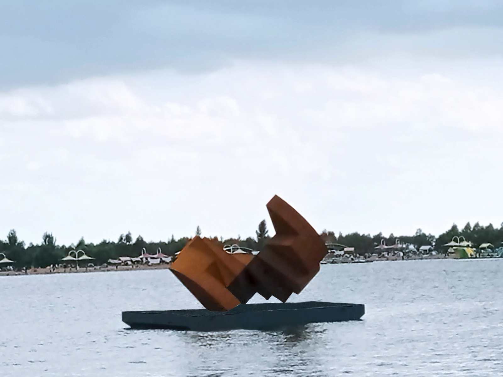 Uma série de degraus horizontais posicionados de forma inclinada formam a mais recente criação de Thierry Ferreira, que flutua numa jangada no rio Song Hua, na China. O escultor de Alcobaça foi um dos 19 artistas (de 16 nacionalidades) que participaram durante a segunda quinzena de julho na edição de estreia do Simpósio Internacional de Escultura de Hulan, na cidade de Harbin, onde desenvolveu “Ascensão horizontal”, obra em aço corten, com 5×6,80×5 metros.