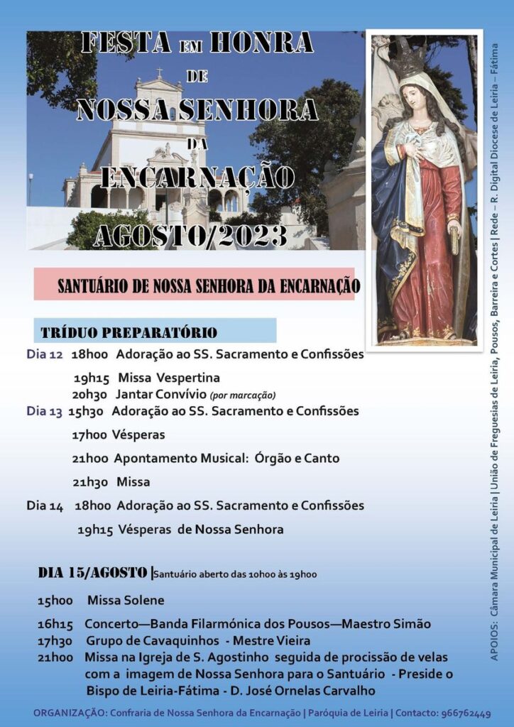 É com programação religiosa que começa esta tarde a histórica Festa em Honra de Nossa Senhora da Encarnação, em Leiria, cuja programação se estende até terça-feira, dia 15 de agosto, quando acontece o ponto alto das comemorações.