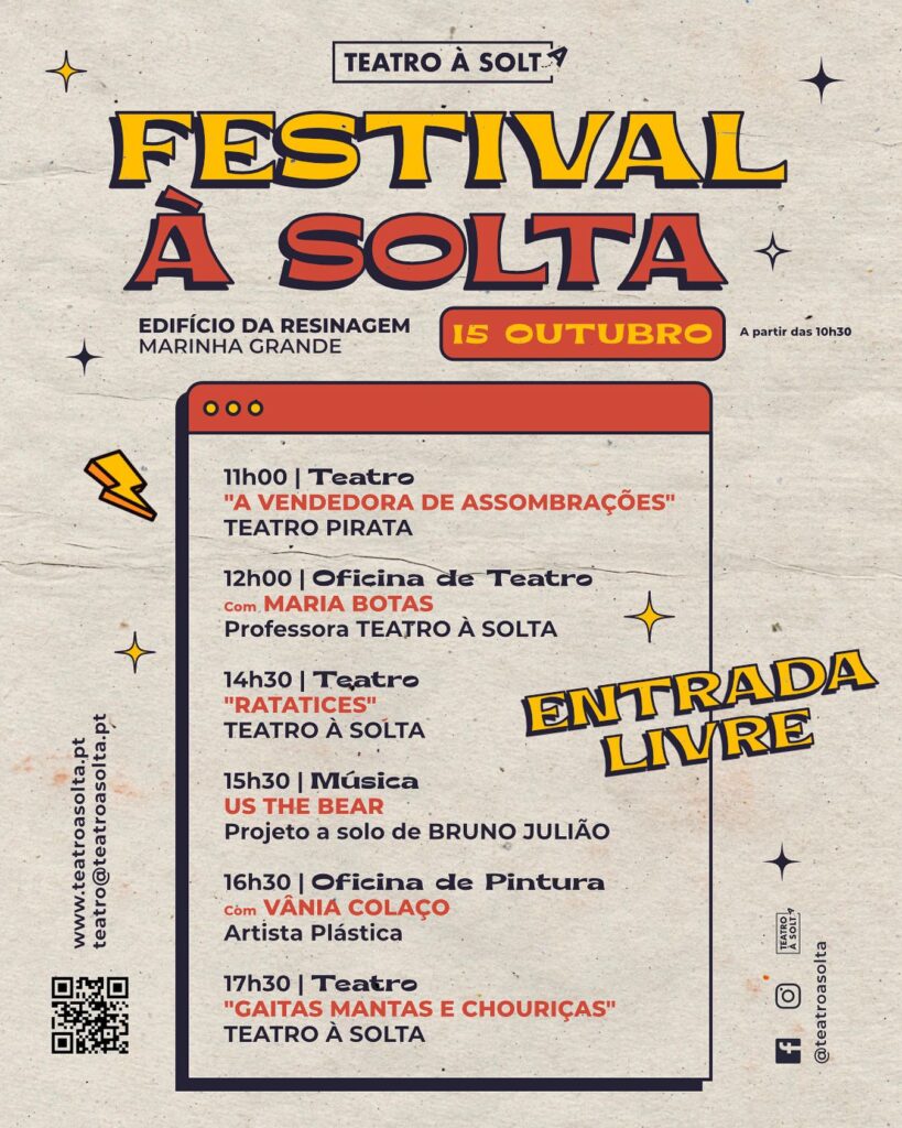 O aniversário da companhia Teatro à Solta vai ser assinalado com seis atividades num único dia, entre teatro, música e pintura, que o Festival à Solta apresenta na Marinha Grande, no dia 15 de outubro.