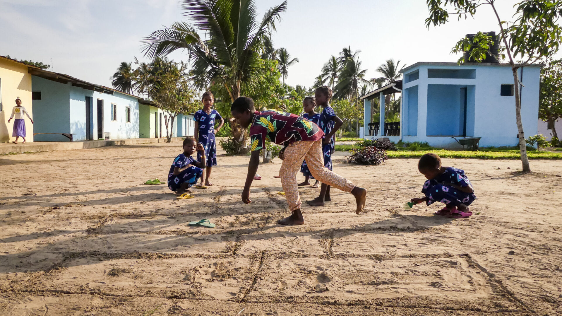 Há uma estrada com cheiro a terra, nua de asfalto e ao fundo, numa clareira entre coqueiros, mangueiras e bananeiras, emerge uma aldeia de alvenaria multicolor, em flagrante contraste com a envolvente de casas feitas em madeira, barro e telhado de folhas de palmeira. Uma igreja, uma biblioteca e um poço, construídos pouco antes, num entroncamento, unem as duas comunidades.