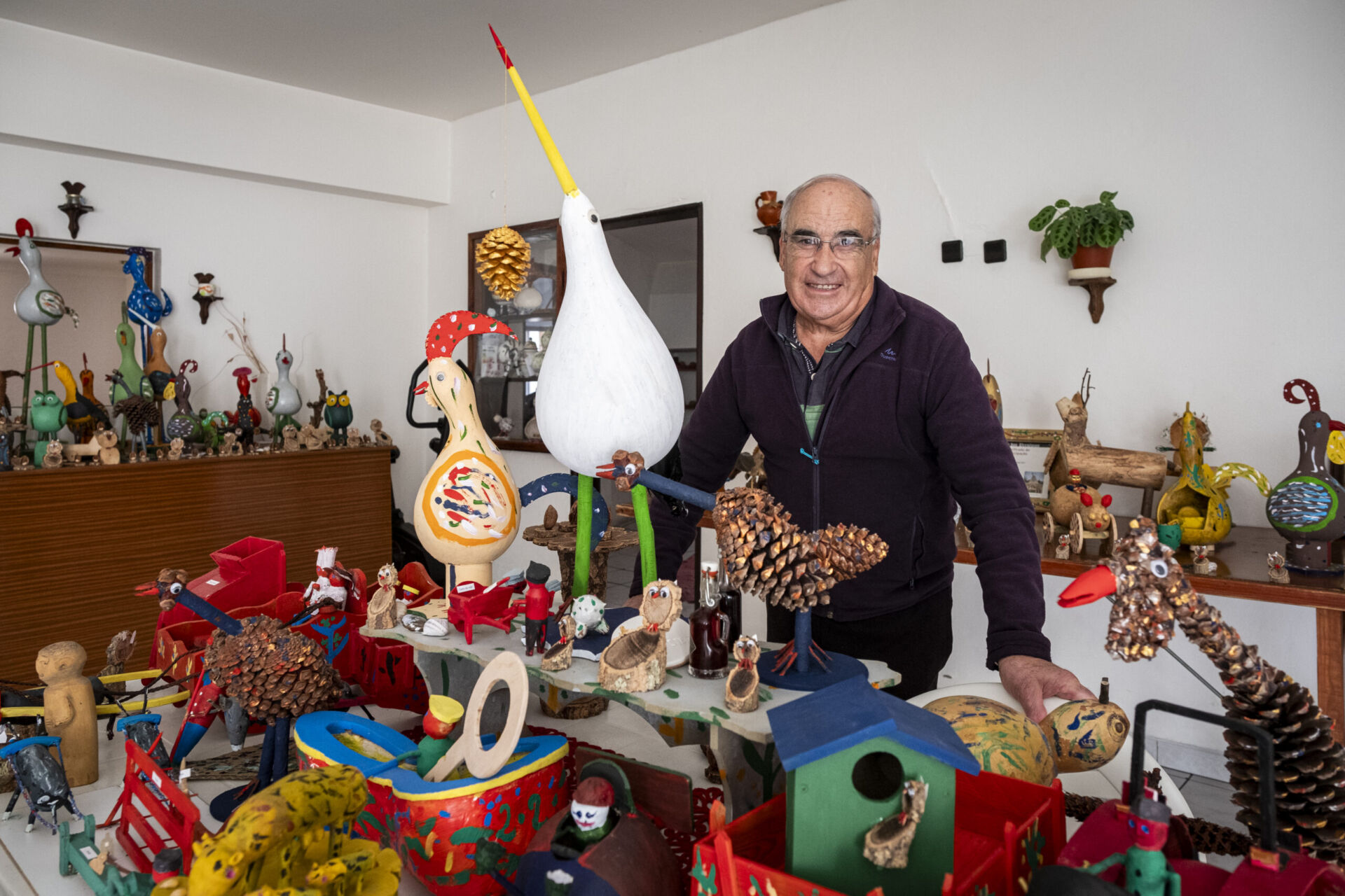 Manuel Rodrigues dedicou uma vida inteira à carpintaria. Reformado, rendeu-se às artes e às reproduções de animais, brinquedos e cenas da vida no campo fazendo uso do que a natureza lhe oferece.