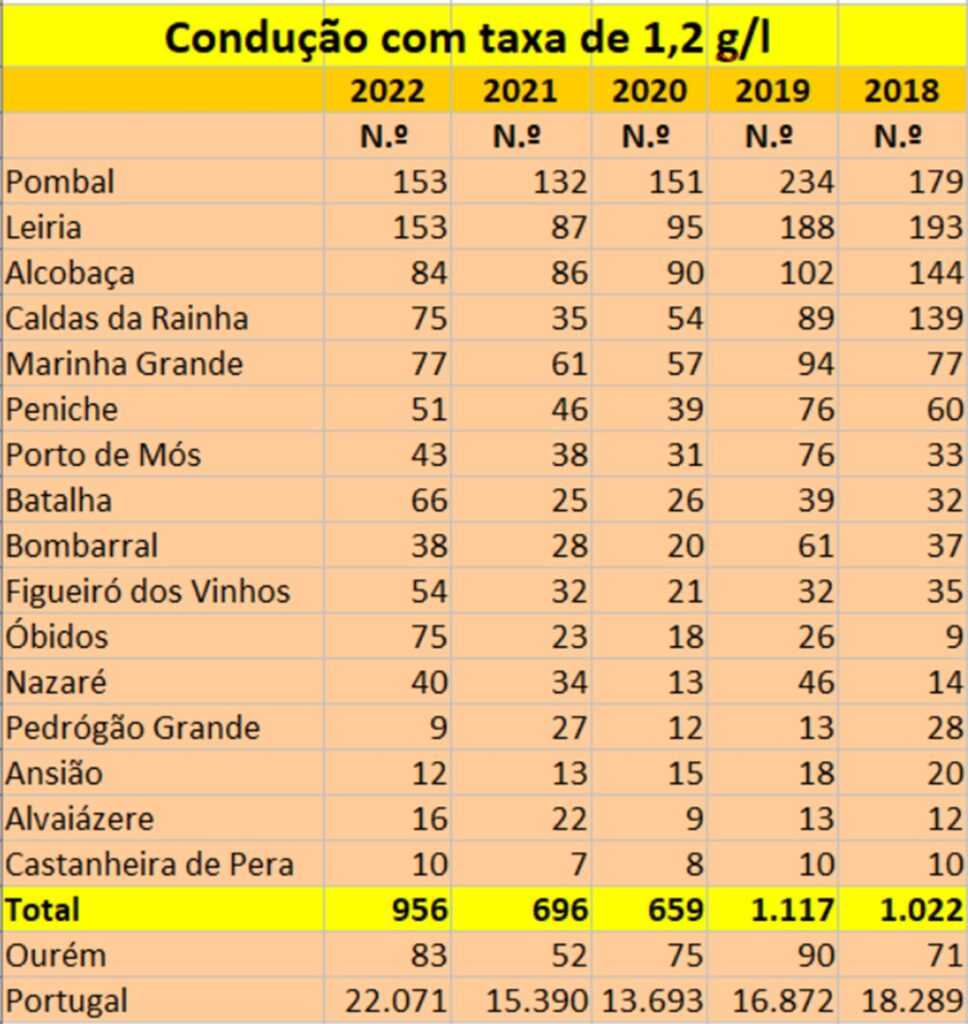 A média mais elevada dos cinco anos é detida por Pombal (169,8 casos), seguindo-se Leiria (143,2) e Alcobaça (101,2). Os concelhos do norte do distrito, com exceção de Figueiró dos Vinhos, apresentam os menores números relativos a condutores apanhados a conduzir com excesso de álcool no sangue.