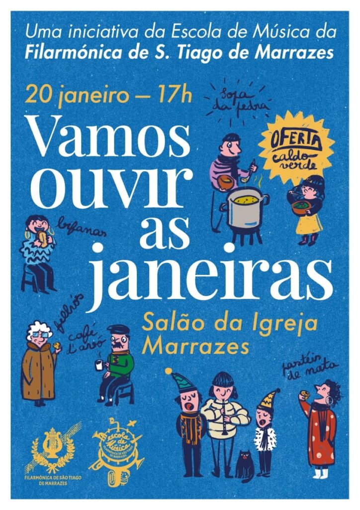 Também nos Marrazes haverá Janeiras no dia 20 de janeiro: a Escola de Musica da Filarmónica de S. Tiago de Marrazes preparou uma sessão de “Vamos ouvir as Janeiras”, no Salão da Igreja, com música e muitos petiscos a acompanhar.