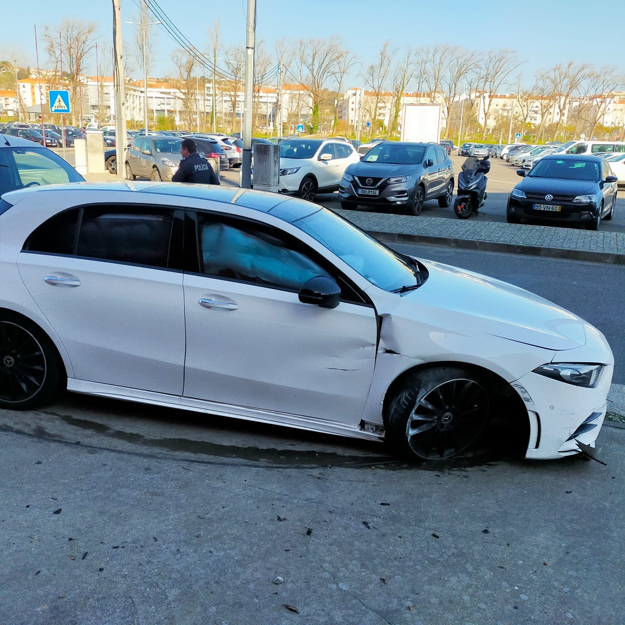 O suspeito prosseguiu caminho entre a zona do Mercado Municipal de Leiria e o estádio Dr. Magalhães Pessoa, “onde acabou por embater novamente”, desta vez “contra um passeio e um poste de iluminação”, provocando danos na carroçaria e no interior do veículo, após acionamento dos airbags, explica ainda a PSP de Leiria em comunicado.