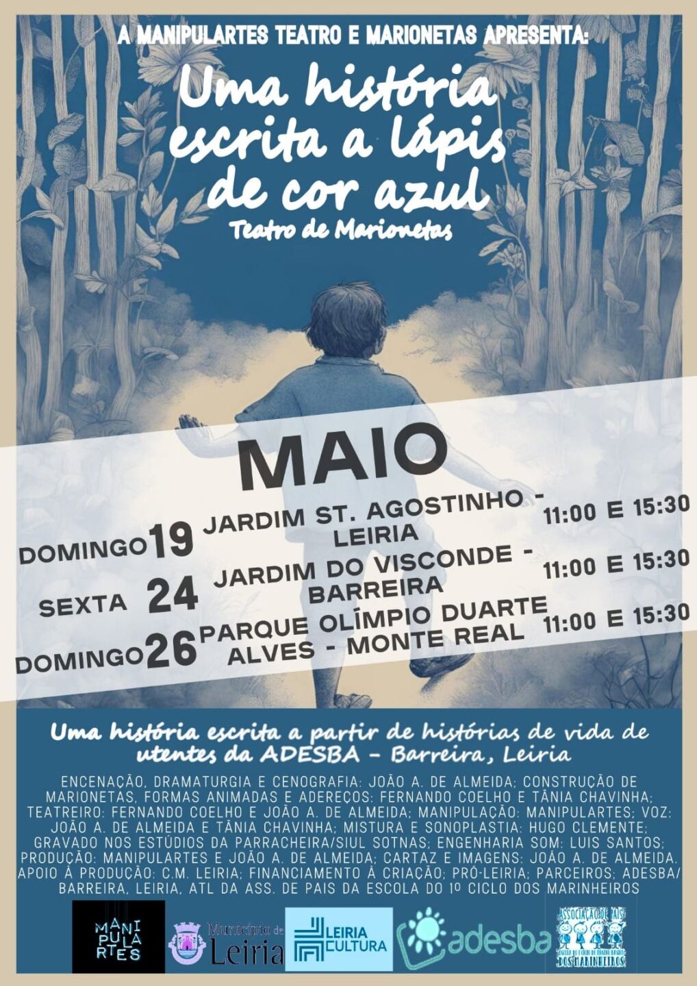 Imaginada por João Augusto de Almeida a partir de histórias de vida de utentes da ADESBA, da Barreira, “Uma história escrita a lápis de cor azul” é a nova produção da Manipulares e estreia este domingo, 19 de maio, num jardim em Leiria.