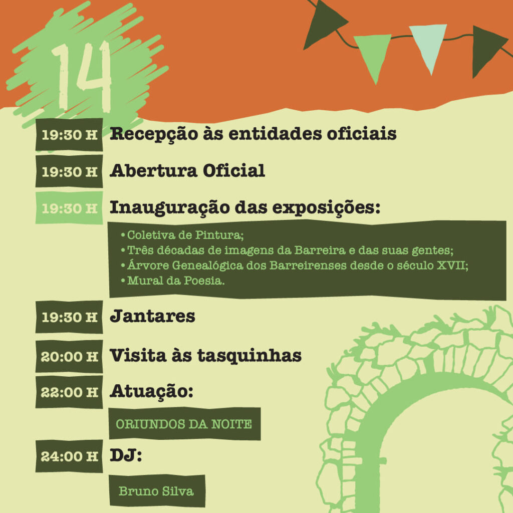 Nesta edição de estreia há propostas para muitos gostos: desde a coletiva de pintura com seis artistas, à antologia com 12 poetas, passando pela tertúlia sobre “Gentes de Abril”, dança, música e dois projetos bastante especiais: a investigação de genealogia que Mário Henriques empreende há 20 anos sobre os naturais da Barreira desde o século XVII – incluindo a árvore genealógica do Visconde, com 18 metros de comprimento e um link para os barreirenses conhecerem a sua genealogia; e a apresentação de filmes de eventos na freguesia, registados desde 1986 por Rui Moniz.