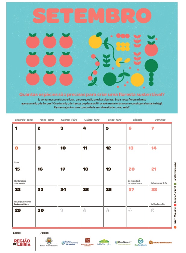 Como sempre acontece, a edição do calendário de parede tem a chancela do REGIÃO DE LEIRIA, em parceria com a Câmara Municipal de Leiria e as empresas Águas do Centro Litoral, BioSmart, Crédito Agrícola, EcoAmbiente, Grupo Iberomoldes e LeiriaShopping.