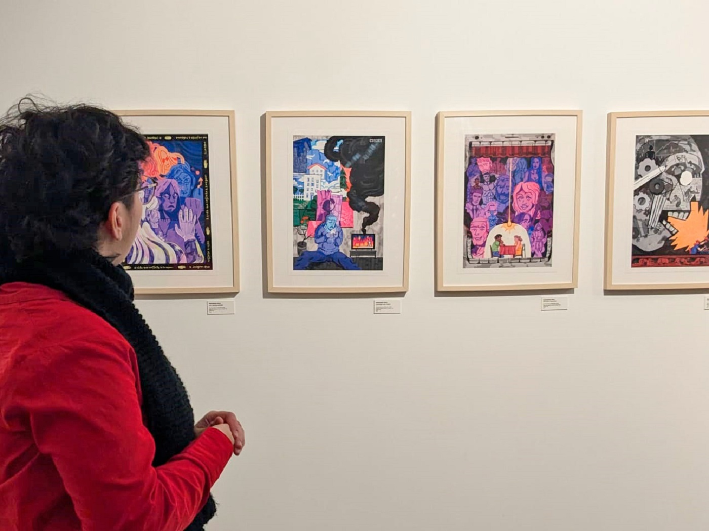 São nove ilustrações de vários tamanhos que contam a história de Catarina Eufémia e “o seu legado enquanto semente de Abril”. Em “Pão, paz e trabalho”, Mariana Sou procurou criar uma exposição de caráter narrativo, que pretende “ser clara o suficiente para dar a conhecer Catarina Eufémia de forma sucinta, salientando a sua coragem”. Ao mesmo tempo, a artista natural de Leiria exalta “o papel das mulheres e da comunidade que a acompanhou nesta luta – e que carregou a sua memória após a sua morte”.