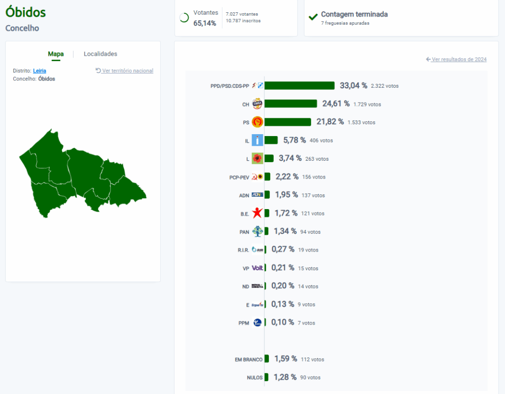 Com uma votação quase semelhante a 2024, a AD manteve-se como a mais votada em Óbidos, onde a novidade é a ultrapassagem do Chega ao PS. Com quase trezentos votos a mais relativamente às legislativas anteriores, o partido de extrema-direita subiu ao segundo lugar, empurrando os socialistas – que perderam 357 eleitores – para o fim do “pódio”.