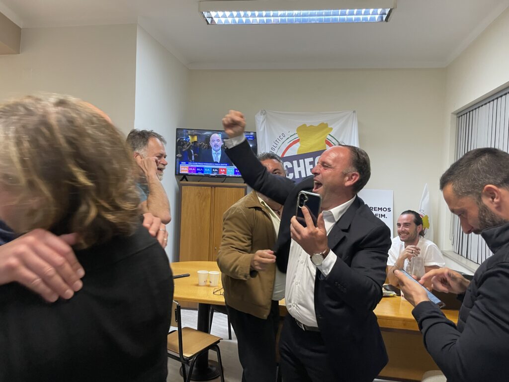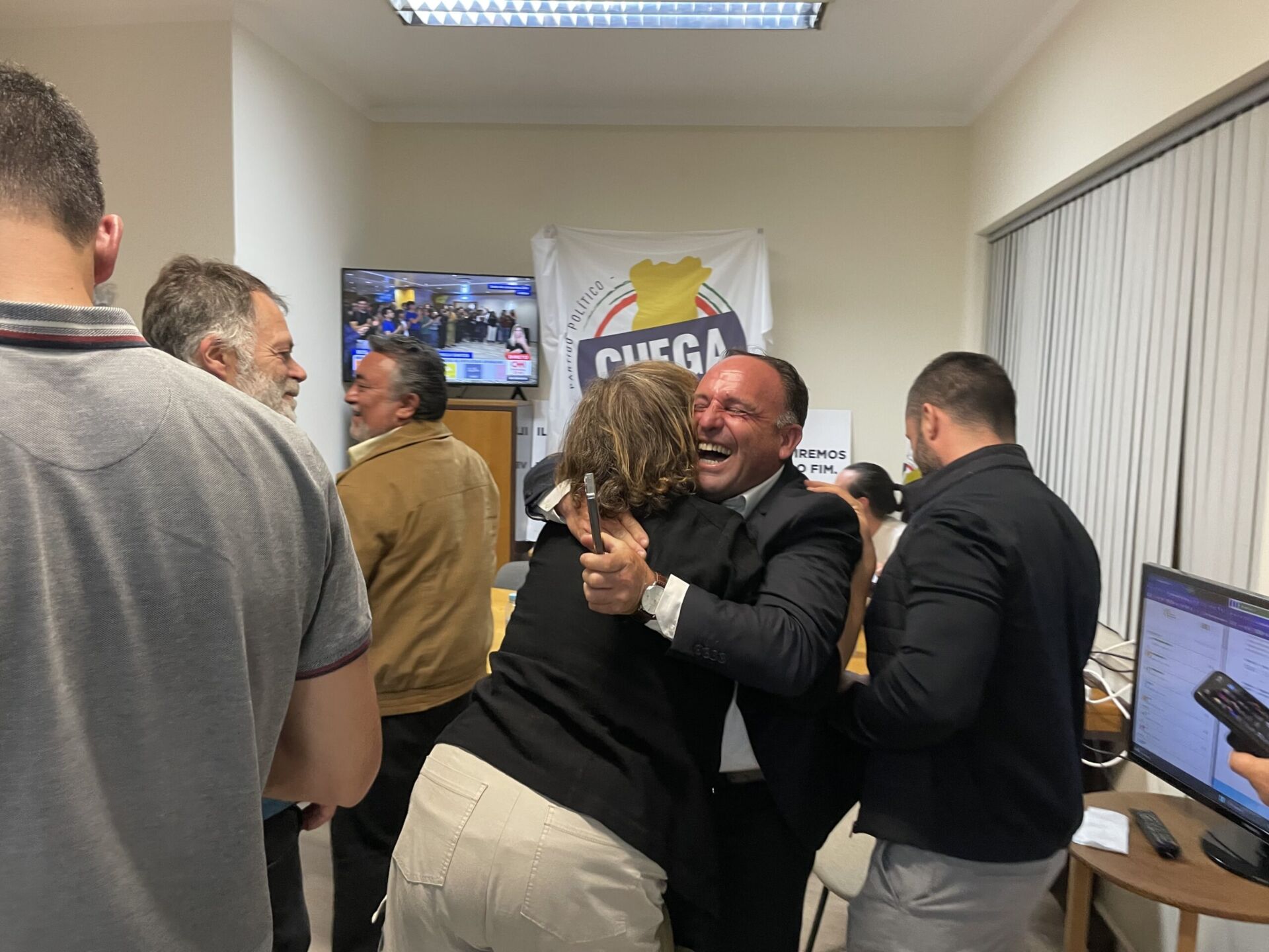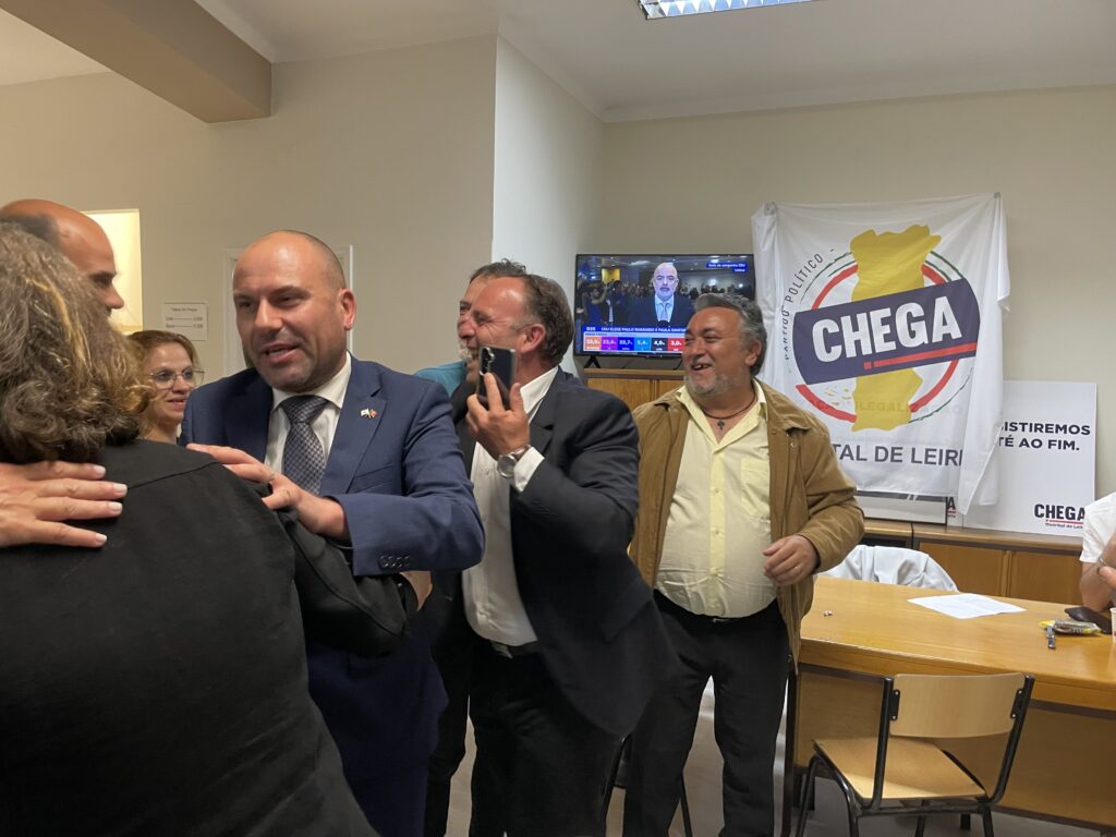 Poucos minutos depois, o resultado na Marinha Grande deixou o deputado ainda mais eufórico: gritou de alegria, começou aos saltos e pegou no telemóvel para dar as boas-novas ao presidente do partido, André Ventura.