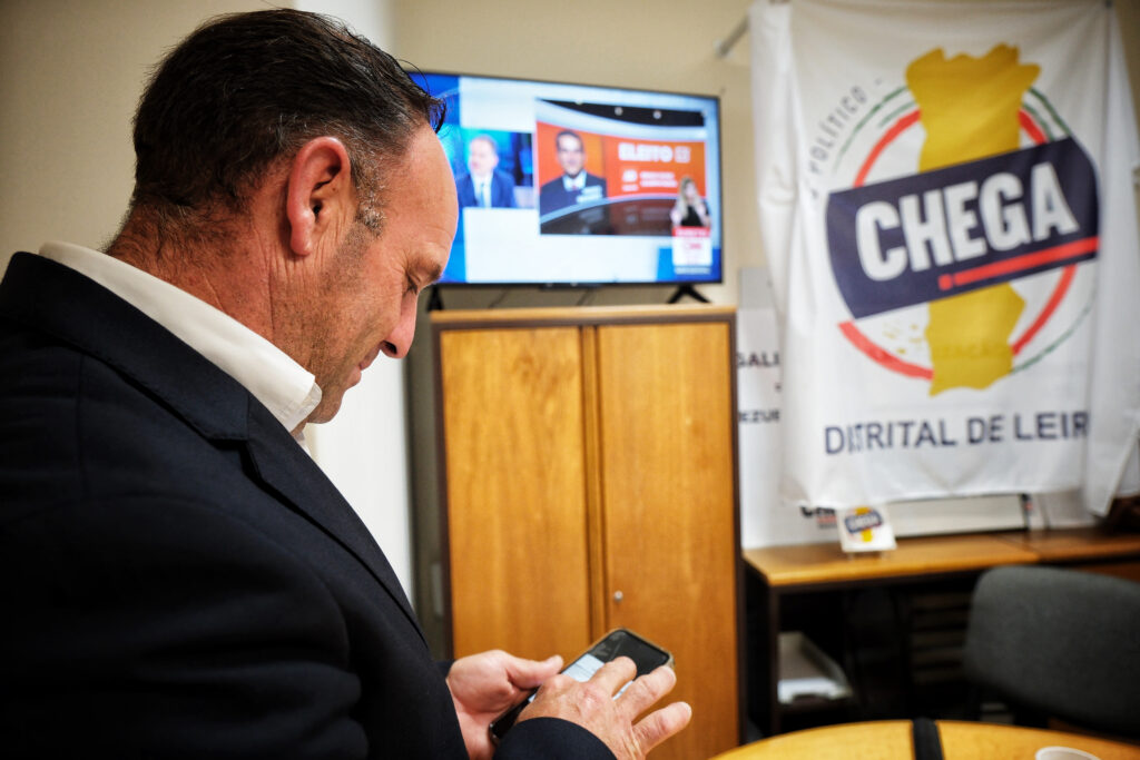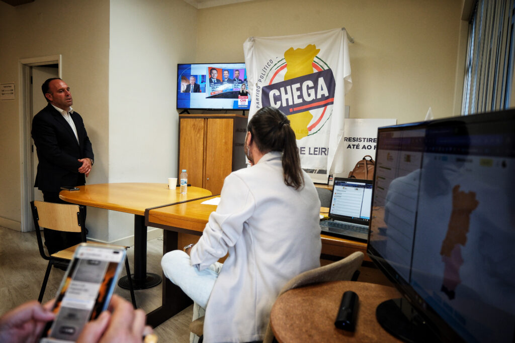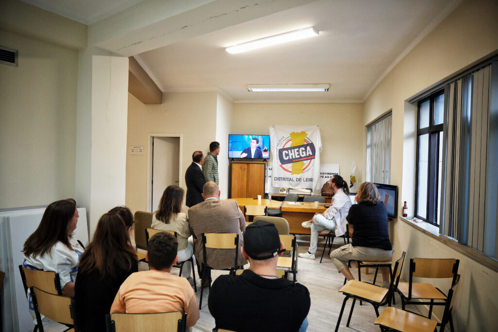 Entre abraços e vivas ao Chega sempre que alguém entrava na sala, vários copos de vinho entornados no chão como reflexo da emoção sentida, os olhares iam-se concentrando nos monitores na expectativa de conseguir eleger um terceiro deputado pelo círculo eleitoral de Leiria.