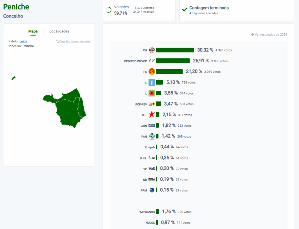 Cambalhota nos resultados destas legislativas em Peniche, com o PS, que tinha sido o mais votado em 2024, a passar para terceiro, por troca com o Chega, que ganha o concelho do sul do distrito de Leiria.