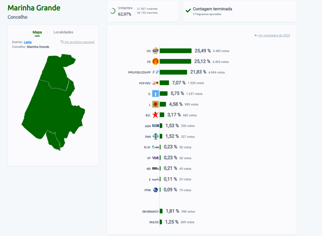 Por uma diferença de apenas 80 votos, o partido de André Ventura relegou o PS para segundo lugar, seguindo-se a AD. A CDU, que em tempos conseguia estar no topo das preferências eleitorais da Marinha Grande, foi a quarta força mais votada.