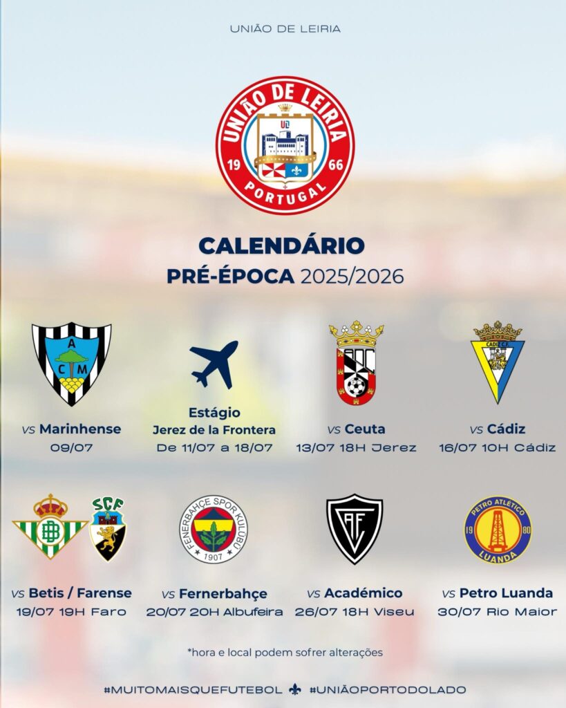 Quanto a jogos-treino, a União de Leiria tem um calendário intenso até final do mês, mas todos acontecem fora de portas. No dia 9 com o At. Marinhense, seguindo-se depois um estágio em Jerez de la Frontera, Espanha, de 11 a 18 de julho, onde joga com o Ceuta, no dia 13, e com o Cádiz, no dia 16.