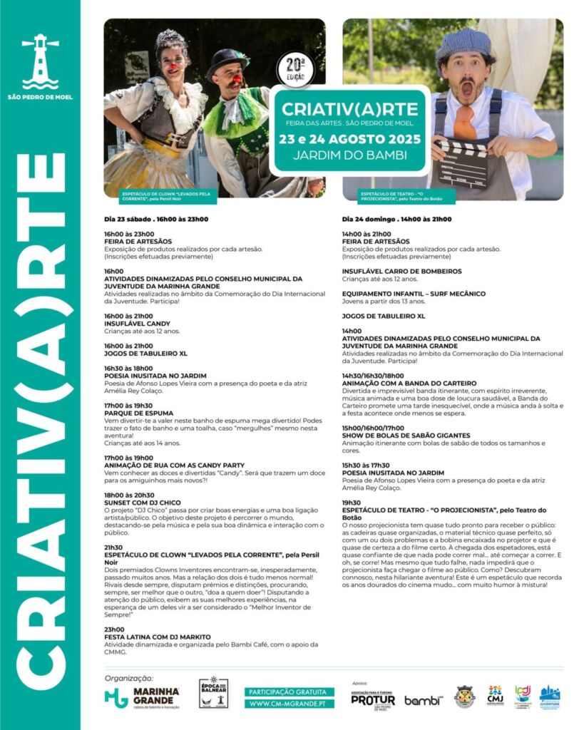 O Jardim do Bambi transforma-se num parque de diversões este fim de semana, com espetáculos ao ar livre, jogos, workshops e exposição de artesanato e outras atividades. É mais uma edição da feira de artes Criativ(A)rte, que decorre em São Pedro de Moel nos dias 23 e 24 de agosto.