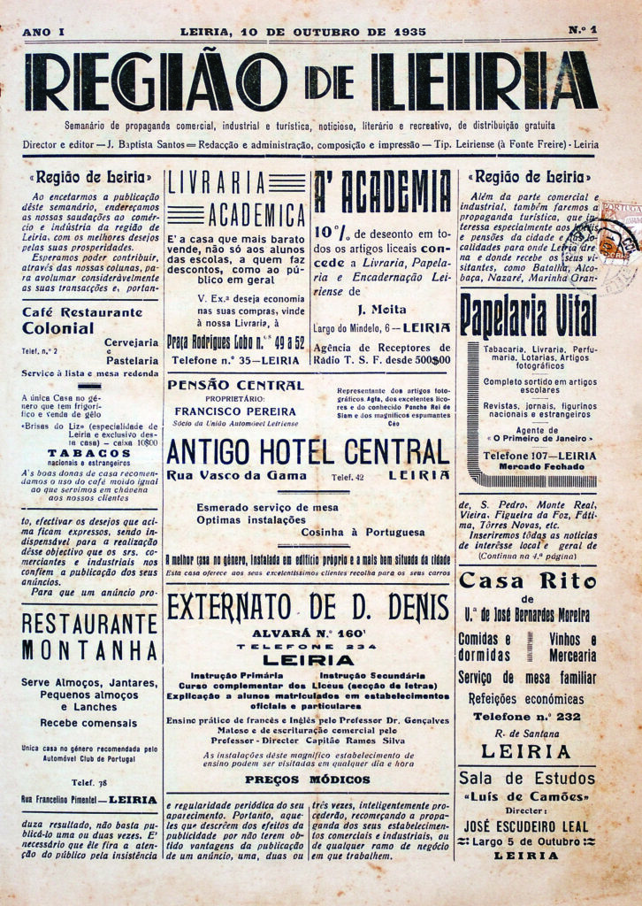 Este não foi, todavia, o assunto central da primeira edição. O que viram os primeiros leitores do REGIÃO DE LEIRIA? As primeiras palavras do jornal foram dirigidas ao tecido económico: “Ao encetarmos a publicação deste semanário, endereçamos as nossas saudações ao comércio e indústria da região de Leiria, com os melhores desejos pelas suas prosperidades.” E acrescentava: “É indispensável (…) que os srs. comerciantes e industriais nos confiem a publicação dos seus anúncios.”