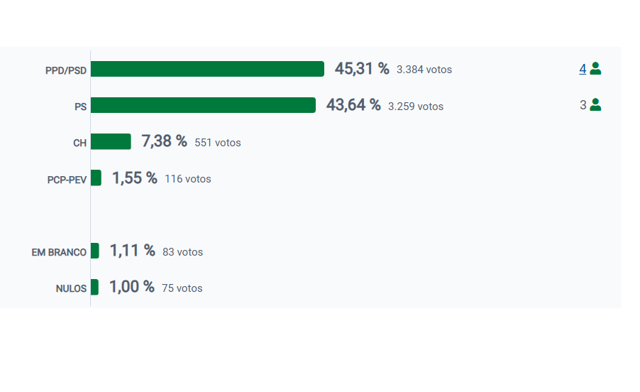 António José Domingues falhou a reeleição, ficando o PS em segundo lugar, com 43,64% dos votos (3.259). São também vereadores da oposição Jorge Paulo Fernandes e Paula Silva.