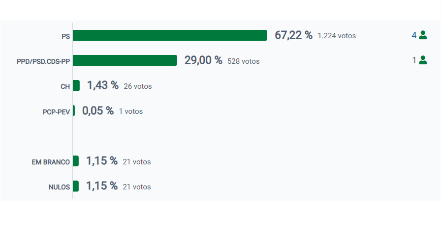 Percentualmente, o PS obteve 67,22% dos votos (1.224), enquanto a coligação PSD/CDS-PP teve 29% (528).