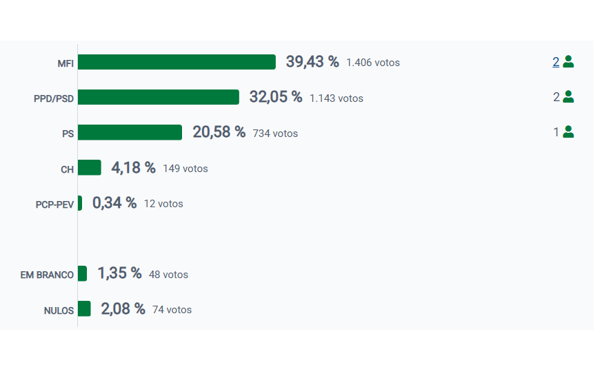 Em segundo lugar ficou o PSD, com 32%, que garantem lugar de vereador a Luís Filipe Silva e Jorge Humberto Lopes.