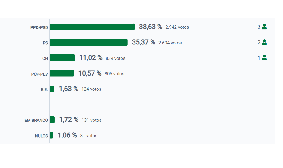 A candidatura “laranja” convenceu quase mais 1.200 eleitores do que em 2021, somando 2.942 votos, equivalentes a 38,37%, que correspondem a três mandatos, tantos quantos os do PS.