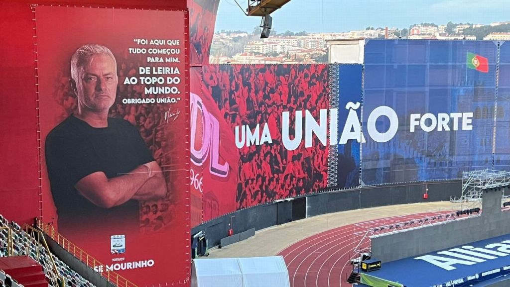 Esta terça-feira, dia 6, quem esteve no estádio de Leiria a assistir à primeira meia-final da Taça da Liga, só conseguiu identificar uma delas, a do antigo bombeiro-ciclista Carlos Vieira. É que a lona com a figura de José Mourinho, onde está inscrita a frase “Foi aqui que tudo começou para mim. De Leiria ao topo do Mundo. Obrigado União”, foi retirada do estádio.