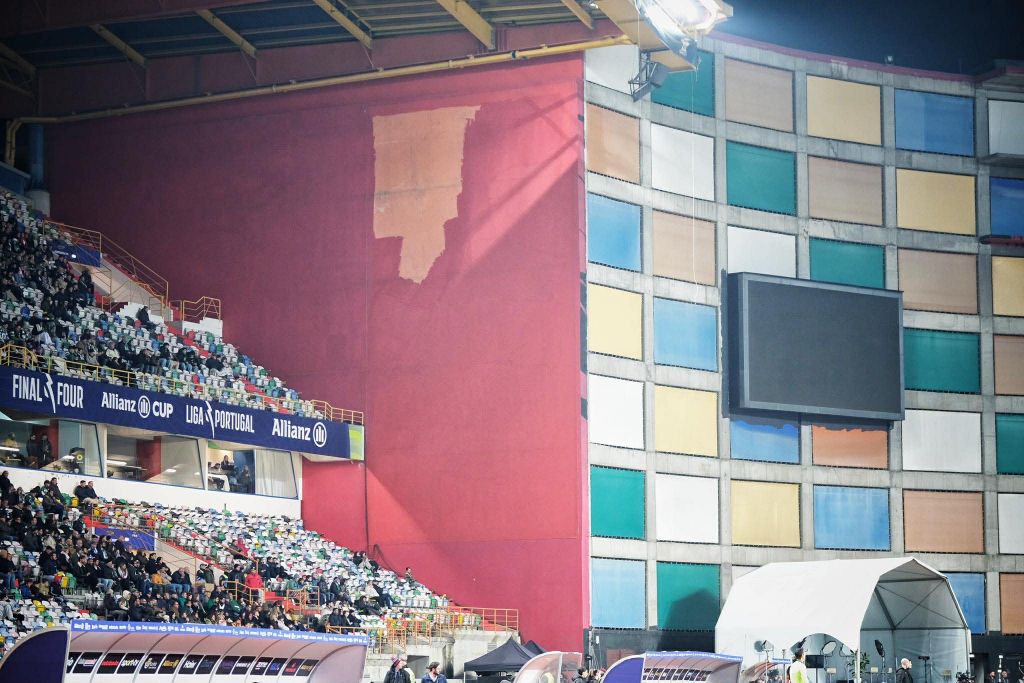 No caso da lona com José Mourinho, agora técnico do Benfica, equipa que joga esta quarta-feira em Leiria com o Sp. Braga, por um lugar na final da prova, o equipamento foi mesmo retirado e, no seu lugar, surgiu uma parede vermelha, que a tinta não preencheu na totalidade, com uma mancha a lembrar a anterior cor daquela zona do estádio, em tons de laranja.
