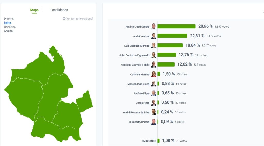 No concelho de Ansião, a vitória é de António José Seguro, com 28,66% dos votos, seguido de André Ventura (22,31%) e Luís Marques Mendes (18,84%). Cotrim de Figueiredo (13,76%) e Henrique Gouveia e Melo (12,62%) fecham o top-5 dos mais votados.