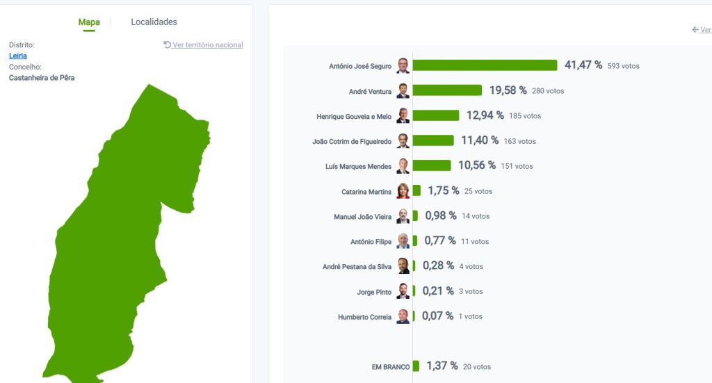 Em Castanheira de Pera, os 1.465 eleitores que se deslocaram às urnas escolheram também António José Seguro como o candidato preferido, com 41,47%. André Ventura ficou abaixo dos 20% (19,58%), seguido de Henrique Gouveia e Melo (12,94), Cotrim de Figueiredo (11,40%) e Luís Marques Mendes (10,56%).