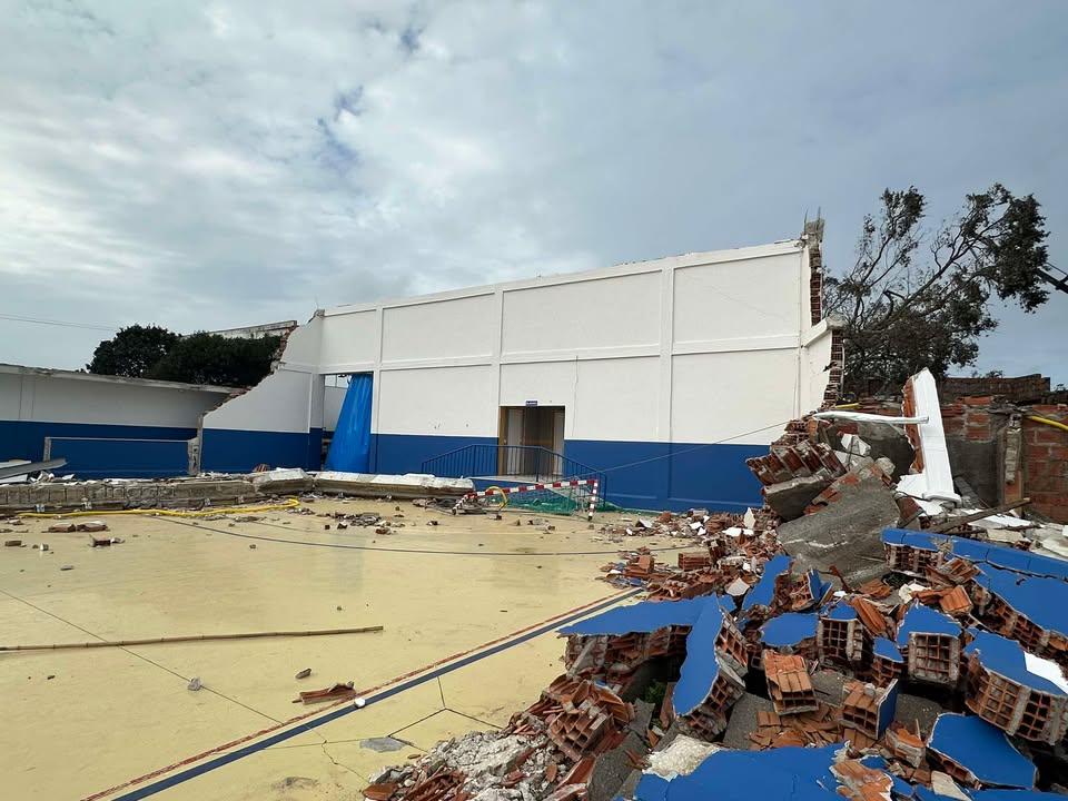 O pavilhão de futsal desmoronou por completo. Os tijolos acumulam-se pelo chão e as telhas voaram. “As áreas da sala de formação e reuniões, a zona do bar e a cozinha também foram afetadas e estamos a aguardar que o tempo melhore para conseguir arranjar o telhado”, explica.