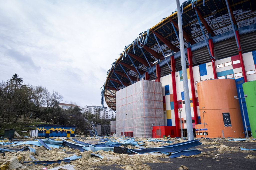 A imagem do revestimento da cobertura do estádio dr. Magalhães Pessoa, em Leiria, enrolado, como se uma folha se tratasse, correu televisões e jornais nas primeiras horas do dia 28. As ações de limpeza ainda estão a decorrer e serão necessárias algumas semanas de trabalho, além das vistorias técnicas para que possa voltar a funcionar e receber competições.
