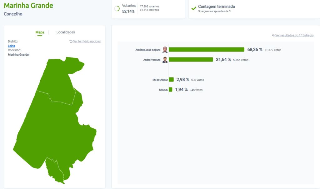 Na Marinha Grande, onde o Chega foi o mais votado na legislativas de 2025, André Ventura recolheu 5.355 votos, correspondentes a 31,64%, superado por larga margem por Seguro, com 11.572 votos, equivalentes a 68,36%.
