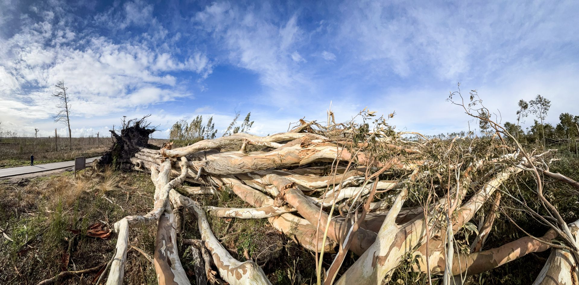 Ricardo Machado, responsável do coletivo One Piece After Another, é mais ativo no litoral, mas o seu olhar estende-se também para o rasto de destruição no Pinhal, provocado pela tempestade Kristin, que “tombou quase todas as árvores do Pinhal de Leiria, incluindo o gigante eucalipto centenário”.