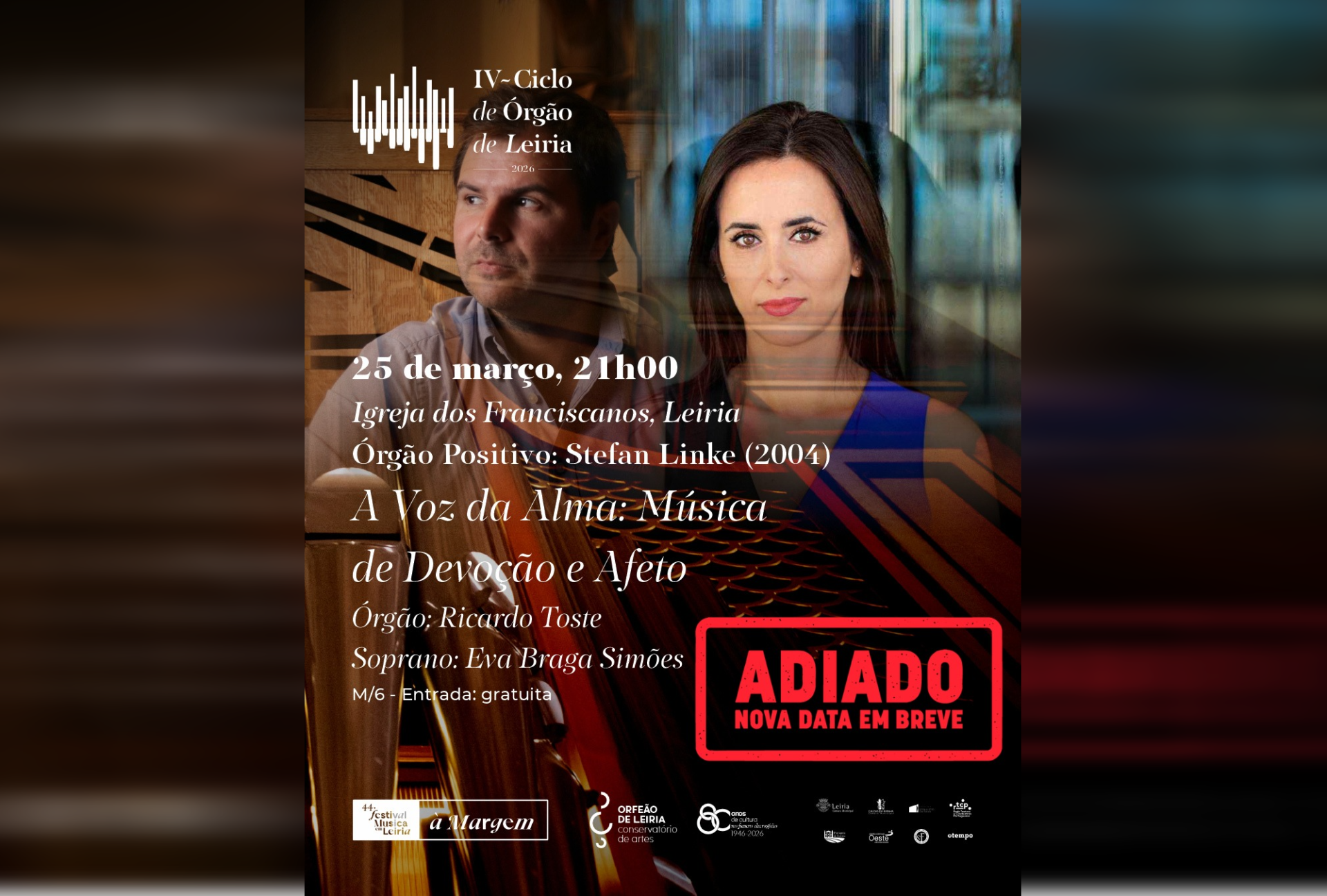 O espetáculo “A voz da alma: Música de devoção e afeto”, que deveria acontecer esta quarta-feira, dia 25, na Igreja dos Franciscanos, em Leiria, foi adiado, anunciou o Orfeão de Leiria.