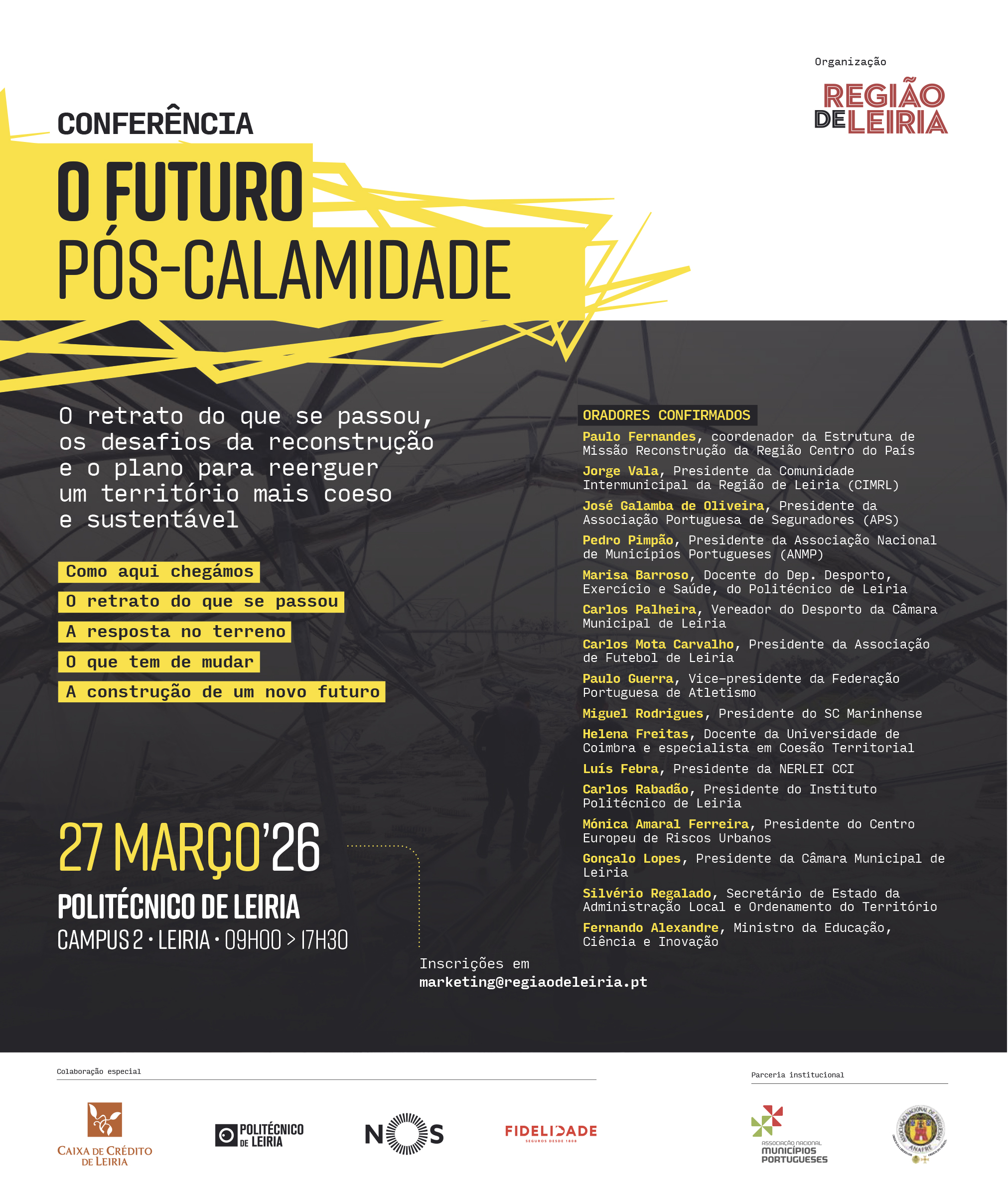 “O Futuro Pós-Calamidade” é o tema da conferência promovida pelo jornal REGIÃO DE LEIRIA, no próximo dia 27 de março, que pretende refletir de forma aprofundada sobre os desafios da reconstrução após fenómenos extremos, analisando o sucedido este ano e apontando caminhos para um território mais resiliente e sustentável.