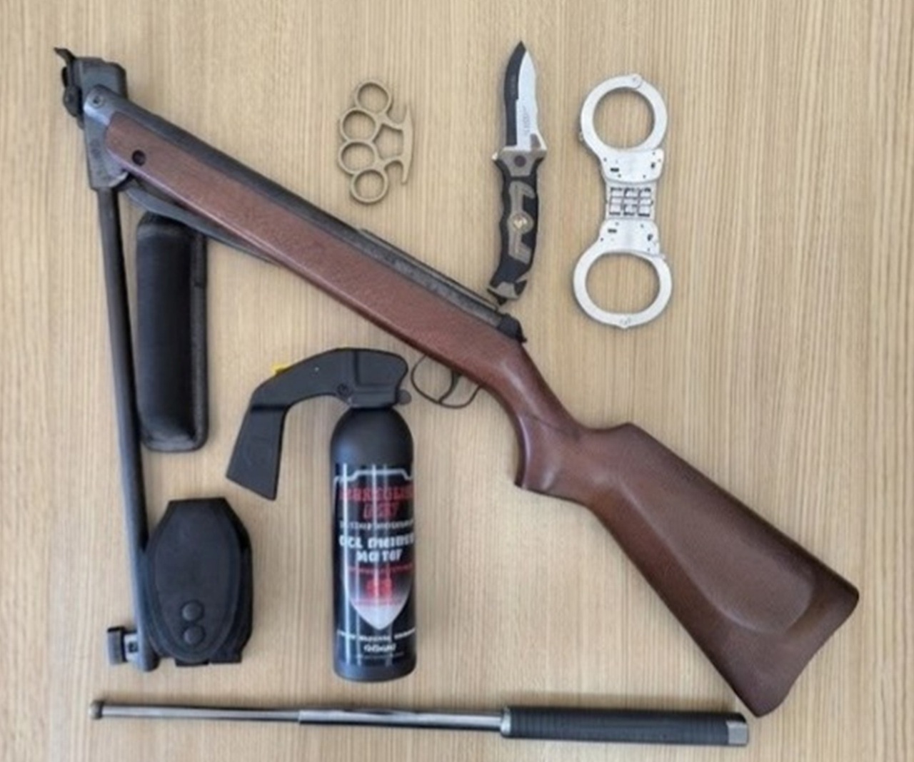 Entre o material apreendido, entregue voluntariamente pelo suspeito, constam uma arma de pressão de ar de calibre 4,5, uma navalha, uma soqueira, um bastão extensível, gás lacrimogéneo em gel e um par de algemas.