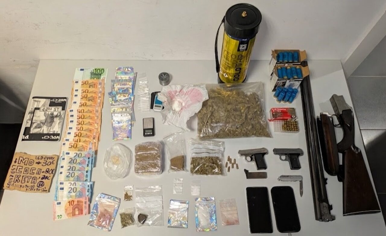 De acordo com balanço da GNR, foram encontradas duas armas de fogo de calibre 6.35mm e 40 munições, uma espingarda e 55 cartuchos de calibre 12, além de 184 doses de cocaína, 870 doses de canábis, 17,7 gramas de crack, 31 comprimidos de MDMA, 4,9 gramas de ketamina, uma grinder (aparelho para moer estupefaciente), duas balanças de precisão, uma garrafa de óxido nitroso, um canivete e 780 euros em numerário.