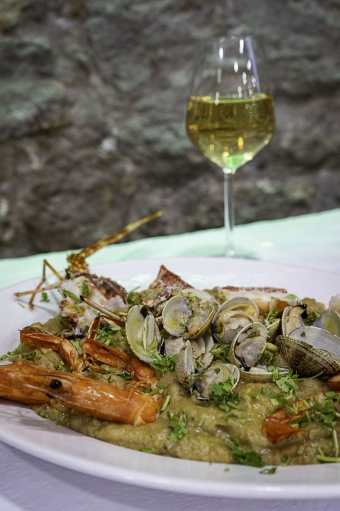 No cimo da escarpa, sobranceiro ao mar, ergue-se um restaurante de paragem obrigatória. “Os clientes não ficam indiferentes à paisagem”, nota Marco Maia, que se ocupa da gestão e divide os afazeres da cozinha com a esposa Joana. “De vez em quando, nas marés vivas, temos a sorte de sermos brindados com as ondas a bater no vidro. O que é dramático para uns, é uma festa para outros”, descreve. No inverno, a maresia “é mais intensa” e o público também vem, atraído pela beleza e calma de São Pedro de Moel e os atributos desta cozinha, em operação do meio dia até altas horas. Há quem almoce e “ao jantar ainda aqui esteja”, na esplanada ou na sala, acolhidos pela simpatia da equipa. O fundador e proprietário, Armando Arcanjo Maia, pai de Marco, é um anfitrião natural, cativando pelas histórias de vida e a atenção dada aos clientes, que se sentem em casa. Entre peixes e mariscos desta costa, a variedade é grande e a ementa extensa: vai do simples petisco, como a saladinha de ovas, até elaboradas composições. Ostras, amêijoas à bulhão pato, berbigão, navalheiras ou lagostins abrem caminho ao camarão tigre Jumbo, à sapateiras, lagostas, santolas e lavagantes, ao peixe fresco para grelhar ou apresentar em massadas e cataplanas. O polvo à lagareiro, as açordas com mariscos, feijoadas de camarão e choco, imponentes mariscadas e cortes de carne, sem esquecer a doçaria, fazem acreditar que a qualidade não passa de moda.