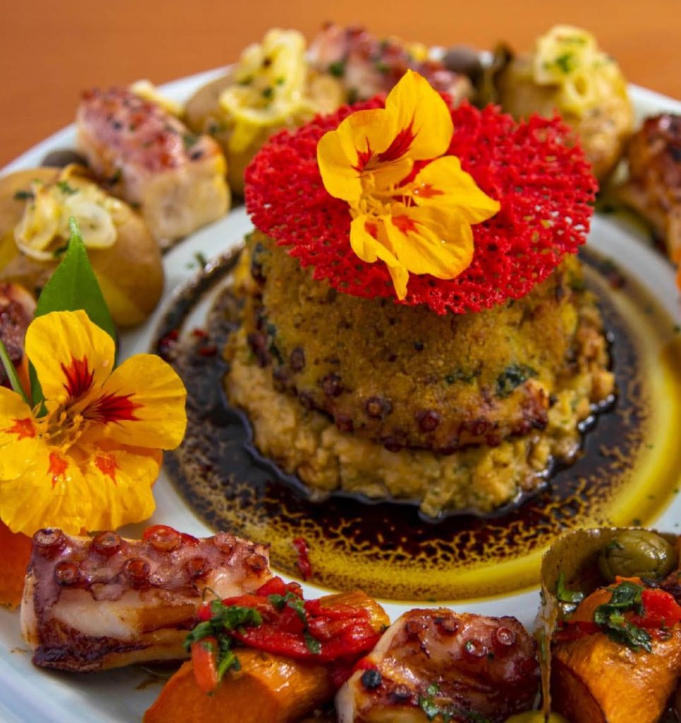 O nome deste restaurante com vista para a vila da Nazaré e o mar é uma alusão ao continente único e às viagens que Carlos e Zaneta Ferreira fizeram pelo mundo quando trabalharam nos cruzeiros. Mapas e relógios convocam esse imaginário e a gastronomia funde influências nacionais e internacionais, como se vê no “Cantinho Pangeia”, uma ‘montra’ de pratos de várias partes do globo. A ideia foi sempre “marcar pela diferença” e a grande especialidade é o polvo, que pode servir em carpaccio, arroz e numa trilogia: grelhado, assado e com broa. Mas a ementa é uma sucessão de deleites que vão do ceviche de robalo às sopas, saladas como a de pera, gorgonzola e nozes, passando pelos peixes frescos, o ensopado de peixe e mariscos, o bacalhau, a trilogia de carnes e os bifes. A ponta de lança, na doçaria, é a kremówka, de
