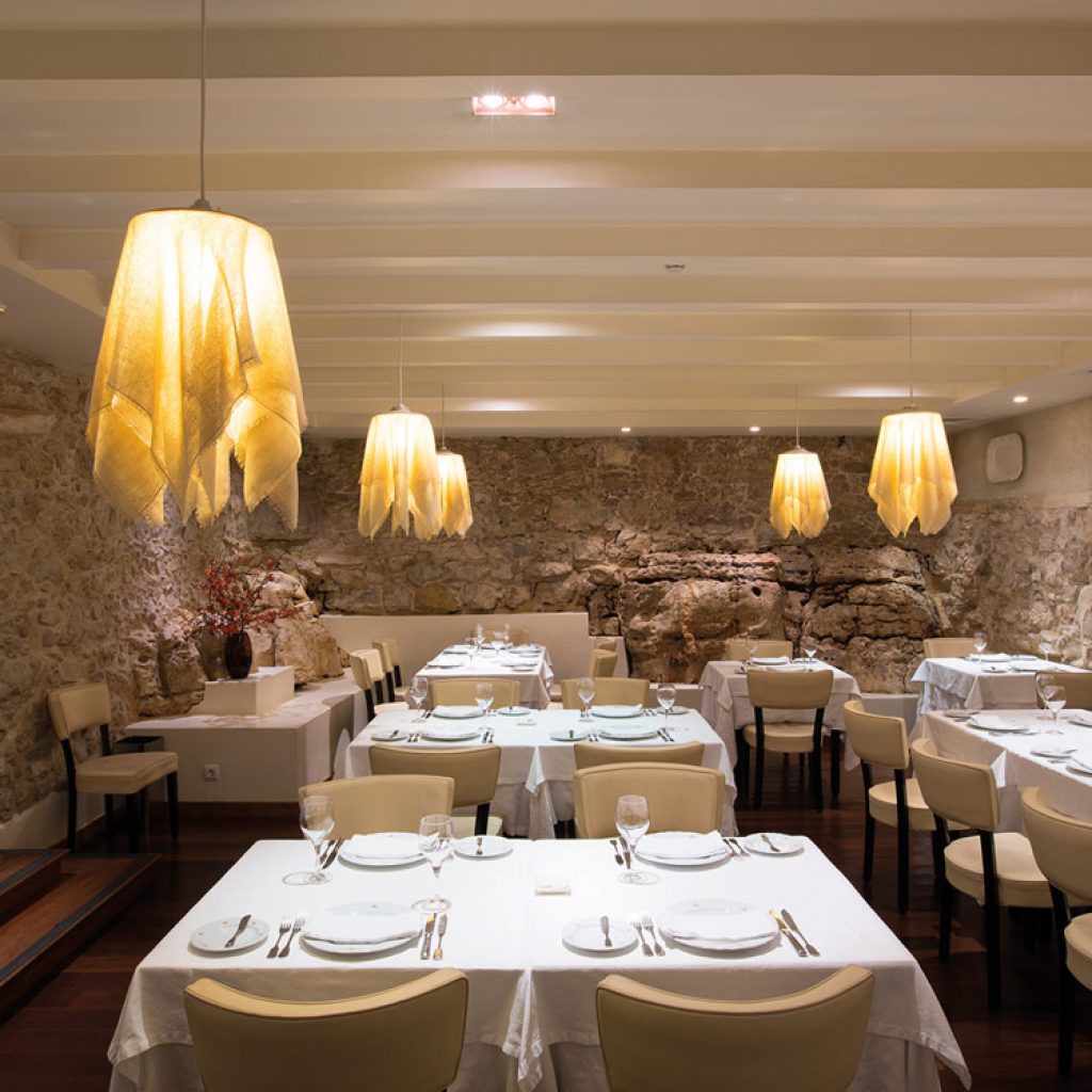 da família, a bordar e a confecionar os pratos, respeitando o preceito e “aquela linha perfeita”. Com lotação muito aquém da demanda, a sala em pedra recebe comensais rendidos ao pão cozido em forno a lenha, manteigas, pastéis de bacalhau, queijo de ovelha amanteigado Serra da Estrela e presunto Ibérico Bolota Maldonado. Nas especialidades constam o bacalhau gratinado (pode levar camarão), as açordas, o
