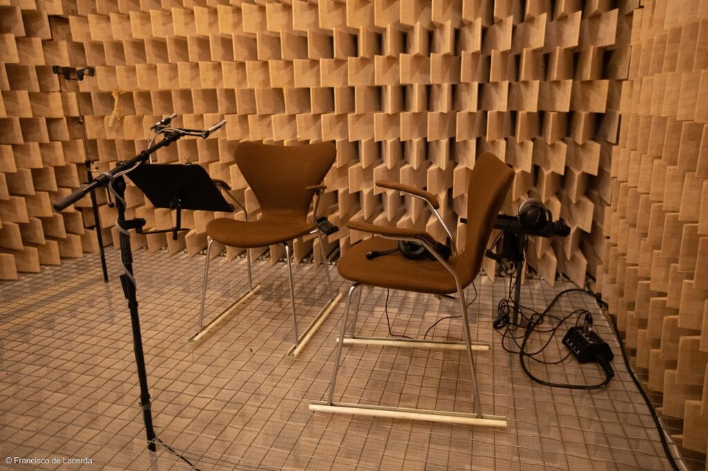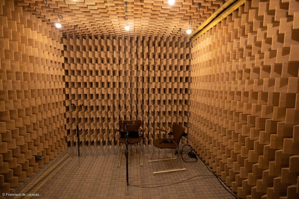 Para fazer estudos acústicos da fala é preciso controlar o sinal que se grava para que não seja contaminado quer por ruídos externos quer por reflexões do próprio sinal que se está a produzir. Uma solução seria gravar os falantes no pico de uma montanha e sem vento, mas uma alternativa mais prática e fiável é fazer as gravações numa câmara anecoica como a que se vê na figura.